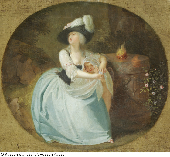 In einer Landschaft mit Felsgestein und Bäumen lehnt sich ein Mädchen in einem hellblauen Kleid an einen Rundaltar mit einem Brandopfer. In die Enden ihres weißen Obergewandes hat sie den Liebesgott Amor gehüllt, der mit erhobenen Händen in Richtung des Betrachters blickt und dessen linker Flügel unter dem transparenten, weiß getupften Stoff hervorschaut. Bogen und Köcher – die Attribute Amors – schmücken, eingefasst von einer Blumengirlande, das Steinrelief des Altars und zeichnen ihn als Altar der Liebe und Freundschaft aus, worauf auch die emporrankenden Rosen hinweisen. Das Kleid des Mädchens mit schwarzem Mieder und halblangen, rüschenbesetzten Ärmeln, die oberhalb der Ellenbogen mit rosafarbenen Schleifen verziert sind, entspricht ebenso wie die Frisur und der schwarze Hut mit der seitlich aufgeschlagenen Krempe, der rosafarbenen Schleife und den weißen Straußenfedern dem Modestil Ende der 1780er Jahre.