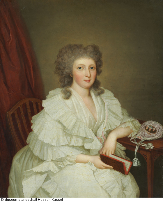 Vor neutralem graubraunem Grund mit einem dunkelroten Vorhang am linken Bildrand sitzt Caroline von Schlotheim (1767-1847), die Mätresse Wilhelms IX. (1743-1821), an einem Tisch, auf den sie ihren linken Arm stützt und einen hellvioletten Stoffbeutel – den Pompadour – abgelegt hat. Sie trägt ein weißes Kleid mit einem weiten, weiß getupften Umhang darüber, der mit breit gefächerten Rüschen gesäumt und von einem rosafarbenen Band eingefasst ist. Dieser taillenlange Umhang mit zwei vorn lang herabhängenden Enden, der so genannte Mantelet, war zwischen 1775 und 1795 ein beliebtes Kleidungsstück. Wie im Porträt aus dem Jahr 1788 (1875/1174) hält Caroline von Schlotheim auch hier ein aufgeschlagenes Buch in der rechten Hand.