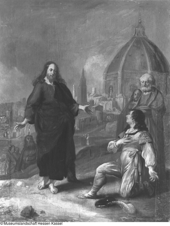 Ein reicher Jüngling fiel vor Jesus aufs Knie und fragte ihn, was er tun müsse, um das ewige Leben zu gewinnen. Als Jesus ihm empfahl, seinen Besitz den Armen zu überlassen und ihm nachzufolgen, ging er traurig davon. (Markus 10, 17-27) * Das früher 1638 gelesene Datum von Roethlisberger richtig entziffert. 1986 tauchte ein weiteres Gemälde des Künstlers mit demselben Thema auf; Verst. London (Christie´s) 17./18. 7. 1986 Nr. 20 m. Abb. (Holz, 21 x 14 cm; signiert und 1640 datiert).