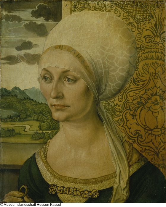 Signatur: unten links über den Fingern: (sehr schwach, das Monogramm des Künstlers von fremder Hand.); oben rechts: ELSPET.NICLAS.TVCHERIN 26 ALT / 1499. (ELSPET.NICLAS.TVCHERIN (IN verbunden) 26 ALT (verbunden) / 1499.; von fremder Hand); Auf der Schließe des Gewandes: NT.; Auf dem Haubenband: MHIMNSK (ungedeutete Buchstaben); in das Hemd eingewebt: WW.; Erworben vermutlich zusammen mit dem Bildnis der Ursula Tucher von Michael Wolgemut (GK 4) zu einem unbekannten Zeitpunkt wohl im frühen 17. Jahrhundert. |