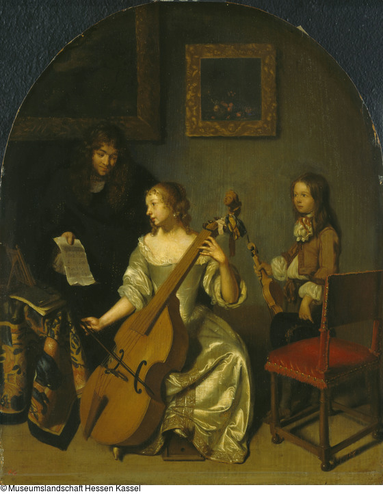 Die galante Szene, bei welcher der Musikmeister der jugendlichen Schönen ein Notenblatt mit dem Ausdruck der Verehrung hinhält, steht in der Tradition von Netschers Lehrer ter Borch. * Nach dem signierten, um 1665 entstandenen Exemplar in Paris, Musée du Louvre, Inv. Nr. 1605, unter Hinzufügung eines großen Bildes links auf der Rückwand. Da stilistisch und qualitativ keine Unterscheide bestehen, dürfte es sich um eine eigenhänige Wiederholung handeln. Zu diesem Urteil kam 1964 auch J. Foucart, Paris. Wieseman dagegen hält das Gemälde für eine Kopie