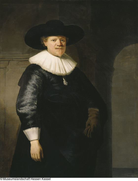 Der Kunsthändler Anthony Rutgers aus Amsterdam hatte das Gemälde 1738 recht kostengünstig erworben und bot es – wie er in einem Brief vom 29. April desselben Jahres schreibt – Wilhelm VIII. als Pendant für das Bildnis des Lucas van Uffelen von Anton van Dyck an (New York, Metropolitan Museum of Art) , das offensichtlich bereits im Besitz des Landgrafen war. Der Gedanke, diese beiden Bilder als Gegenstücke zu inszenieren, verwundert zunächst, da sie – abgesehen von den Maßen – keinerlei Gemeinsamkeiten aufweisen: Rembrandt zeigt in kühlen Tönen eine statuarische, unbewegte Figur, während das Gemälde von Van Dyck in warmer Farbigkeit geradezu der Inbegriff des bewegten Portraits ist. Möglicherweise war es gerade dieser Kontrast, der Rutgers an einer Gegenüberstellung Gefallen finden ließ. In Kassel entschied man sich letztendlich aber gegen diesen Vorschlag. Im Galeriesaal des Landgrafen hing das Bildnis eines Mannes als Pendant zur Saskia.
