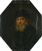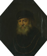 Mit ernstem Gesicht schaut ein weißbärtiger Greis auf den Betrachter, Oberkörper und Kopf leicht nach links gewandt. Als Brustbild dargestellt, wird die Kleidung nur angedeutet: Eine schwarze Mütze mit knapper Krempe, auf der ein Teil einer Goldkette aufblitzt. Um die Schultern liegen zwei Goldketten, die vor der Brust parallel über das schwarze Gewand geführt werden.