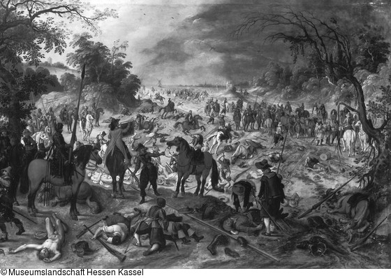 Vrancx ist der Begründer der Schlachtenmalerei im 17. Jh. Anders als viele spätere Künstler schildert er nicht das dramatische, von malerischem Pulverdampf durchwehte Kampfgetümmel (vgl. Wouwerman, GK 354), sondern mit nüchterner Genauigkeit die Schrecken des niederländischen Bürgerkriegs. Ein weiteres eigenhändiges Exemplar (Eichenholz, 55 x 87 cm, bez. rechts unten: V 1611) befand sich 1960 in der Sammlung Heldring, Oosterbeek/Niederlande; drei nackte Leichen wurden in diesem Bild nach 1924 übermalt (vgl. Verst. Kat. Brüssel, Fievez, 8./9.12.1924, Nr. 173, Taf. XI - Verst. Kat. London, Sotheby's, 27.3.1963 Nr. 38 - Kat. A. Brod Gallery London, Spring Exhibition 1963, Nr. 6 m. Abb.).